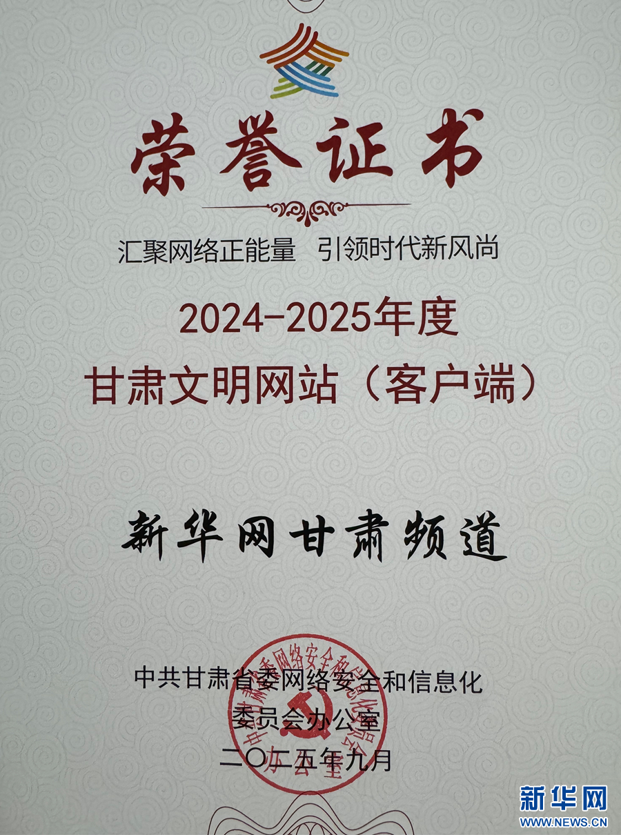 新華網(wǎng)甘肅頻道獲評(píng)“2024—2025年度甘肅文明網(wǎng)站(客戶端)”稱號(hào)。