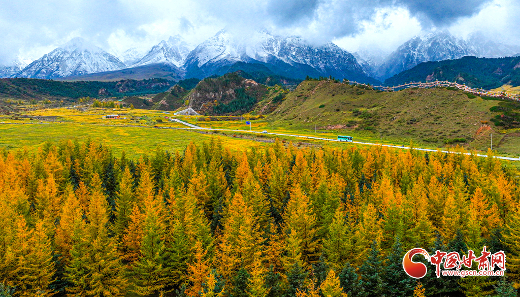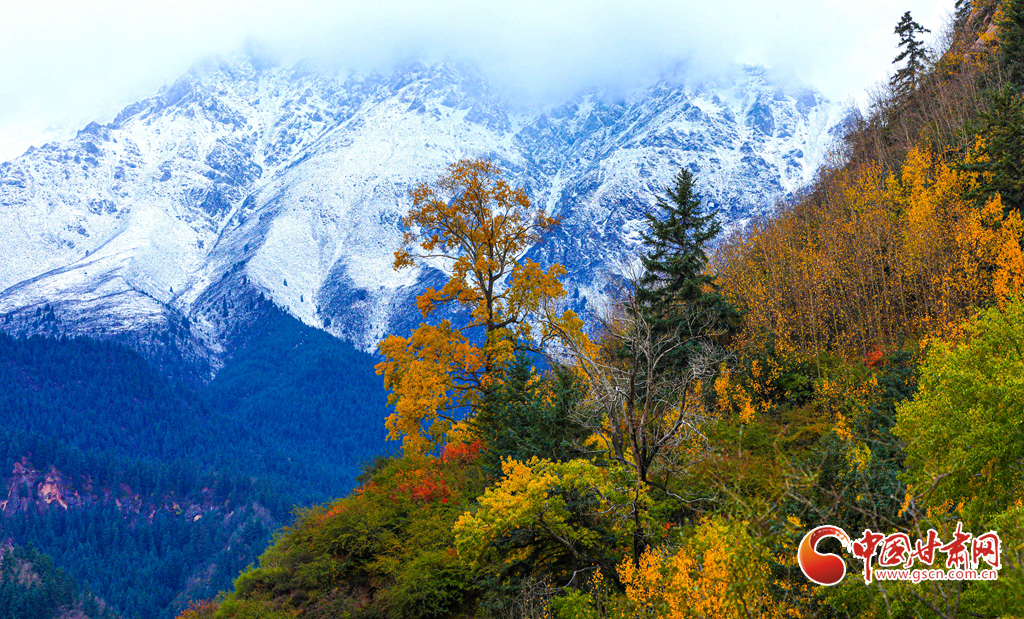 10月11日小雪初霽,祁連山國(guó)家公園肅南裕固族自治縣馬蹄鄉(xiāng)段,繪出一幅深秋畫卷。山頂覆白雪,山間繞輕云,層林盡染,色彩斑斕交織。