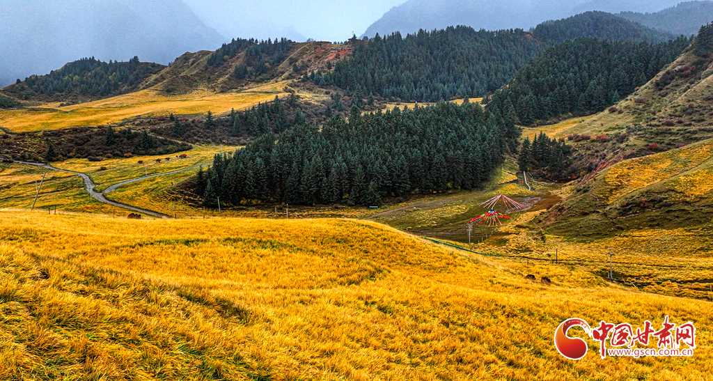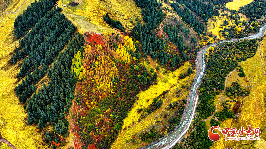 金秋十月,祁連山國(guó)家公園迎來(lái)最絢爛的季節(jié)。雪峰映照著斑斕林海,山霧繚繞其間,原始森林、雪山、草甸、霜葉構(gòu)成垂直景觀帶。雪白、金黃、深紅與湛藍(lán)交相輝映,黃綠為底,紅金點(diǎn)染,宛如一幅渾然天成的油畫。