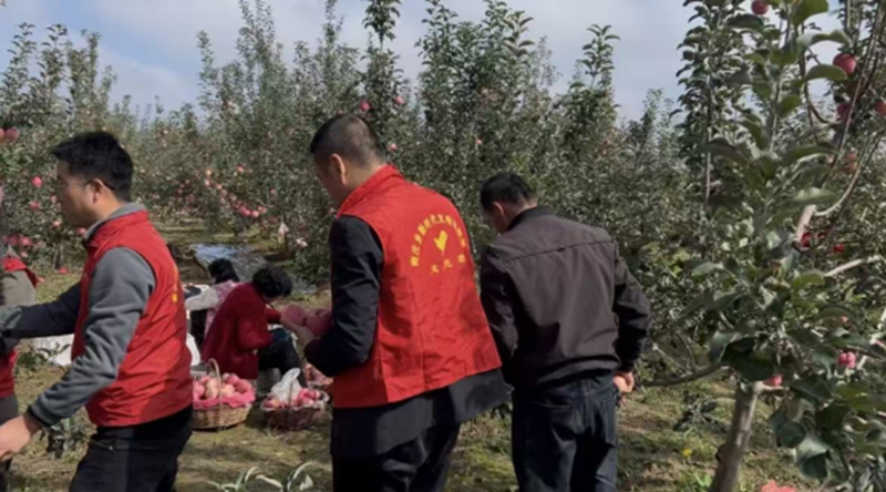 在果農(nóng)岳世德家的果園里,平日里伏案工作的干部職工們,此刻化身“采摘工”,忙碌的身影在果樹間穿梭,鮮艷的紅馬甲與紅蘋果互相映襯。