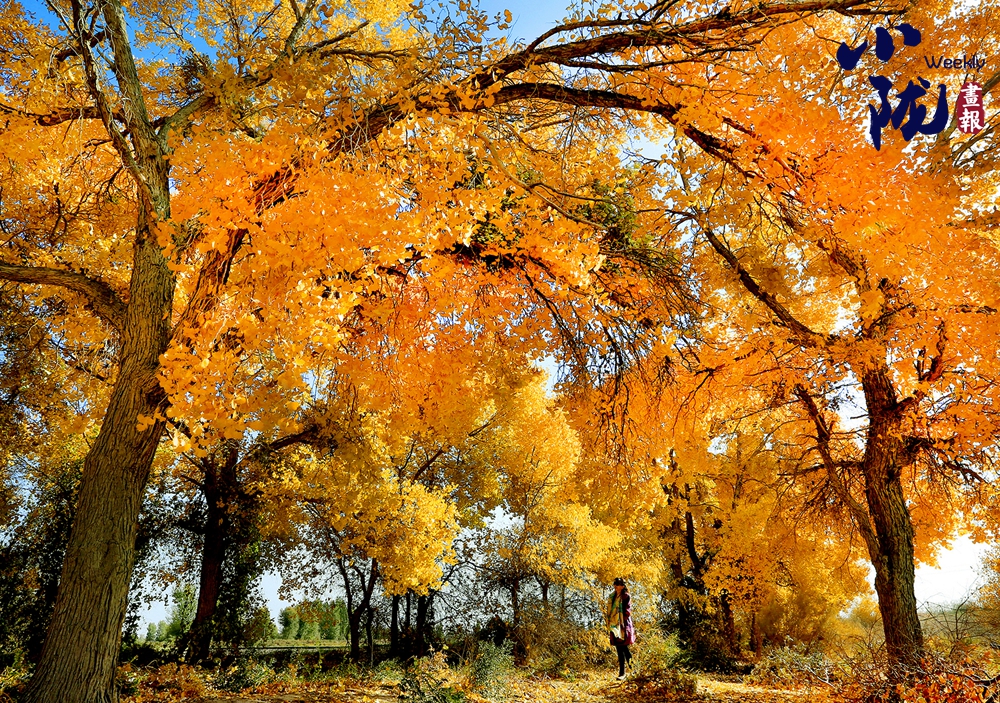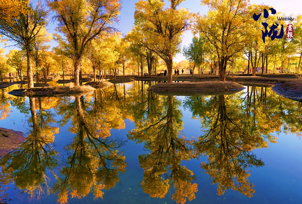 胡楊茂盛,疊翠流金,裊裊身姿倒影湖中。風一吹,樹梢輕顫,成千上萬片葉子像被點燃的火焰,在藍得沒有一絲雜質的天空下翻涌、跳躍,充滿詩意。林間小道上,游客悠閑漫步,盡享美好時光。