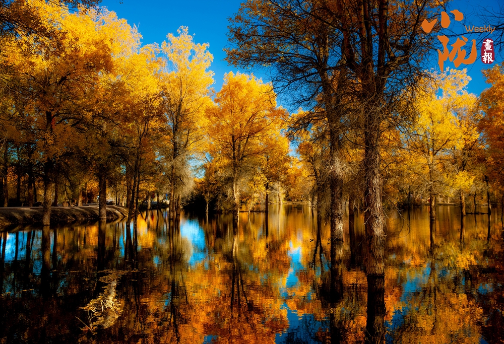 從遠處眺望,連綿不絕的胡楊樹在陽光下閃爍著耀眼的光芒,湖水如一面鏡子,倒映著岸邊的胡楊和藍天白云,意境如古老的西方油畫。