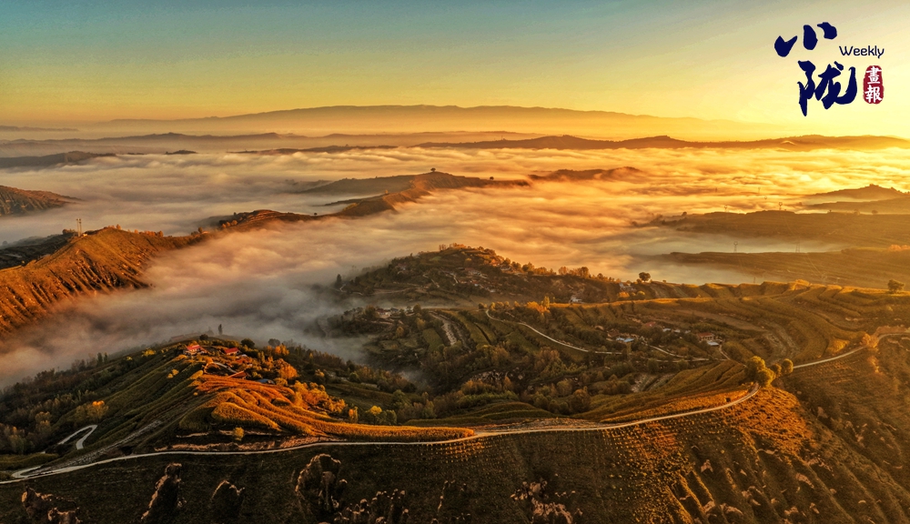 仿佛一夜之間,大北山被染成了暖黃色。極目遠(yuǎn)眺,云海漫過蒼翠的山脊,與天邊燃燒的晚霞交融成流動的錦緞,夢幻般的色彩恣意鋪張,金色與藍(lán)天、山坳交織在一起,格外溫馨浪漫。