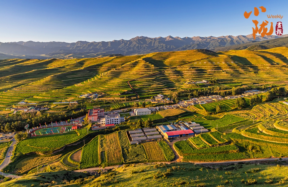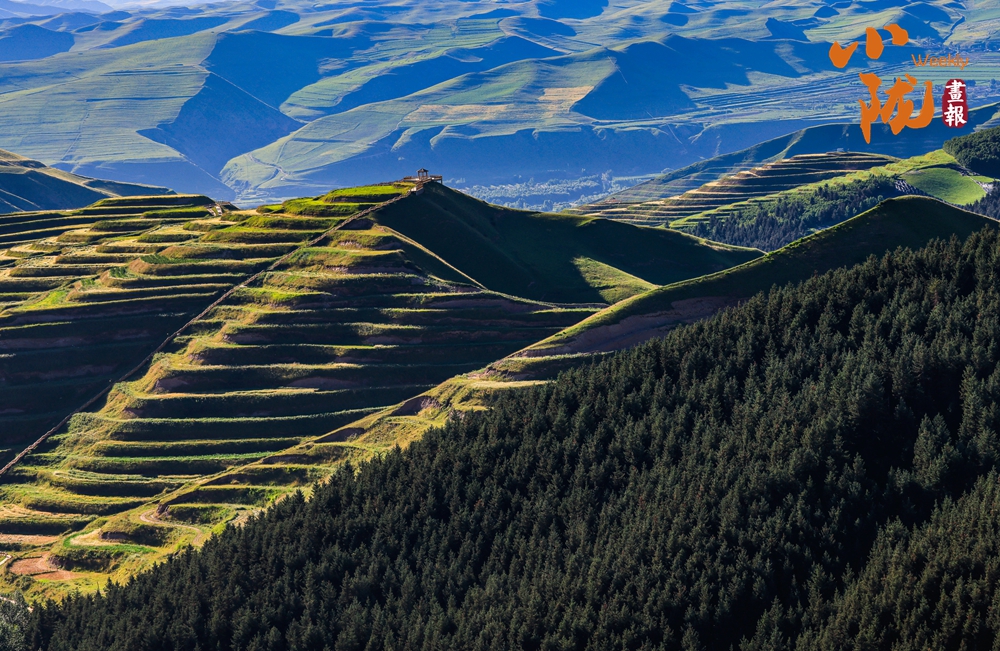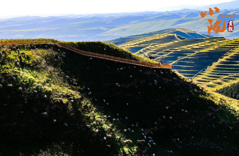 溝壑縱橫,滿目生綠。廣袤的田野在陽光下盡情綻放著大自然的絢麗多彩,熱烈地期盼著新季節(jié)的到來;羊群如散落的云朵,在坡地間緩緩移動,盡享這份寧靜與和諧。