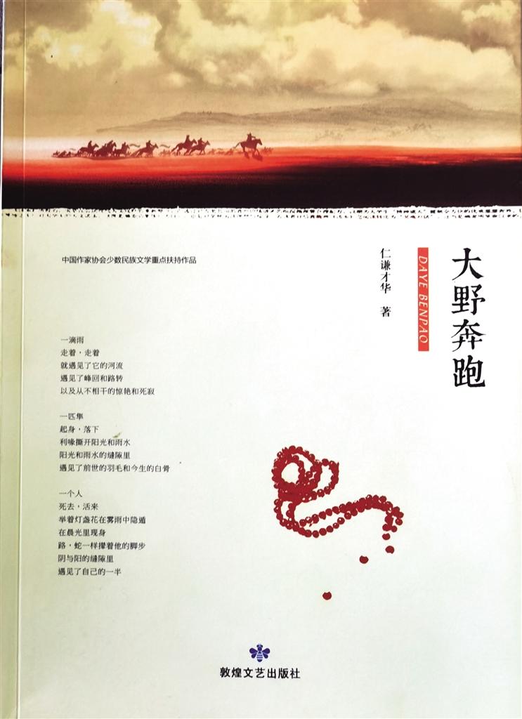 詩歌集《大野奔跑》是仁謙才華近年來的傾心之作,該作品由敦煌文藝出版社出版發(fā)行。詩集由作家張存學(xué)作序,收錄了仁謙才華4年來發(fā)表在《詩刊》等刊物上130余首詩歌。張存學(xué)在序中這樣評價:“語言,既是阻礙,也是抵達(dá)之路,這個緊張度也是考驗一個寫作者的坎,這個坎過得好一些就能夠把握住詩抵達(dá)生命的本真,把握不好,就會在空泛的意象中游走。仁謙才華在這方面的蛻變,從他這本詩集能夠看出,他由早期的直抒胸意、向外張揚變得安靜起來,變得從容而多思,也變得獨立而內(nèi)在……”