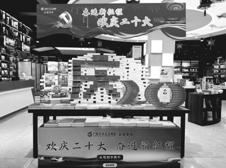 廣西新華書店集團股份有限公司組織全區(qū)各連鎖門店先后開展了“喜迎二十大 助力新發(fā)展”主題圖書展示展銷、“歡慶二十大 奮進新征程”主題系列活動。廣西新華書店集團股份有限公司相關(guān)負責人介紹,全區(qū)門店近期開展“歡慶二十大 奮進新征程”主題門店美陳大賽,通過精選出111個全國近期出版的主題圖書品種進行重點展示,配套主題海報、背景板,以各門店融合當?shù)靥厣拇a堆造型進行整體美陳,向廣大讀者推薦一批導(dǎo)向正確、質(zhì)量上乘的優(yōu)秀主題圖書。