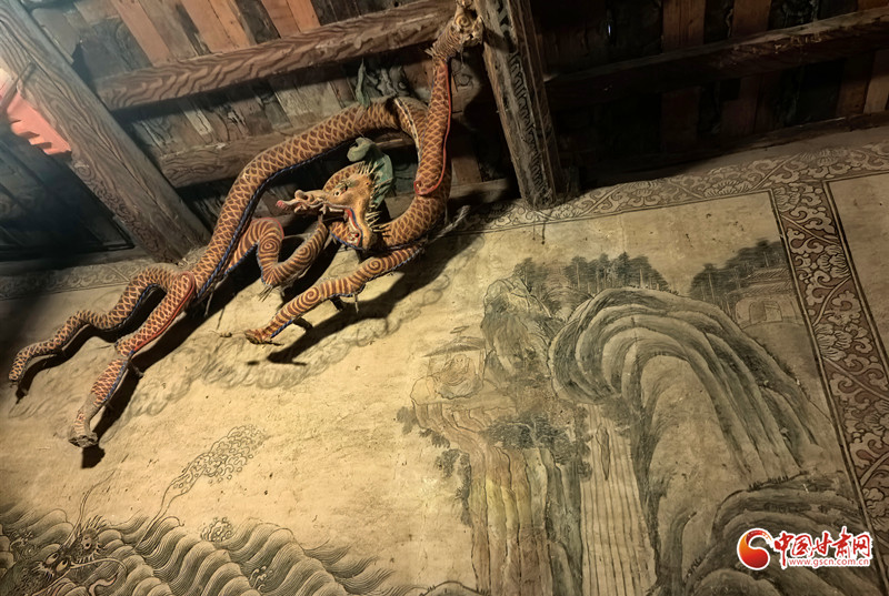 順著羅漢目視的方向望去,龍盤踞于房梁之上,若參照龍背后的壁畫,又仿佛這條龍正翱翔于天空之上。這一獨(dú)特設(shè)計(jì),源于張掖大佛寺深厚的歷史背景。