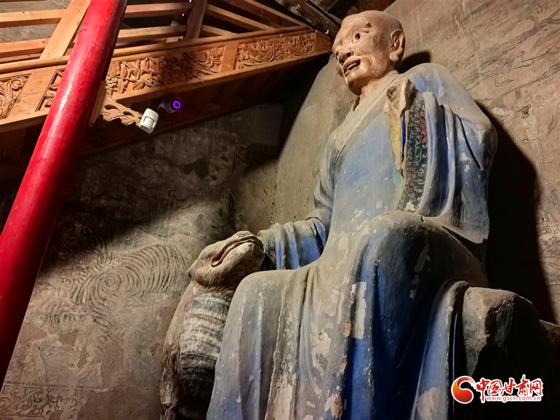 為何要將老虎塑造得如此乖巧?答案就在老虎旁邊的壁畫中。壁畫里的老虎張牙舞爪、張著大嘴,盡顯兇猛之態(tài)。而羅漢手中的老虎卻溫順如貓,這一鮮明對比,恰恰生動(dòng)地說明了羅漢已將老虎降服。